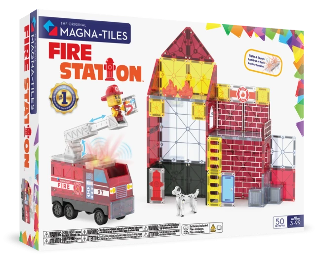 W skład zestawu wchodzą: 50 magnetycznych elementów, w tym figurka strażaka Mix & Match, płytka ze światłem i dźwiękiem oraz rozkładana drabina wozu strażackiego.
