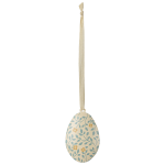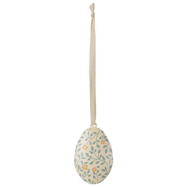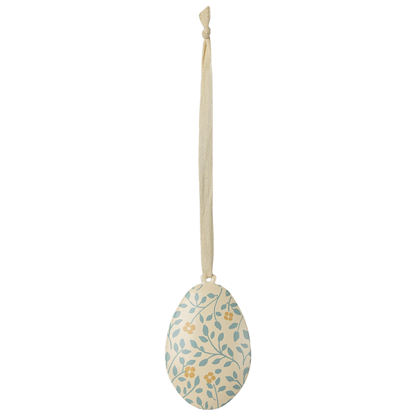 Metalowe ozdoby w kształcie jajek wielkanocnych z nadrukiem kwiatowym na całej powierzchni. Pięknie wyglądają na gałęzi jako dekoracja na stole wielkanocnym. Mieszaj różne kolory z innymi ozdobami wielkanocnymi Maileg, aby dopełnić dekorację.