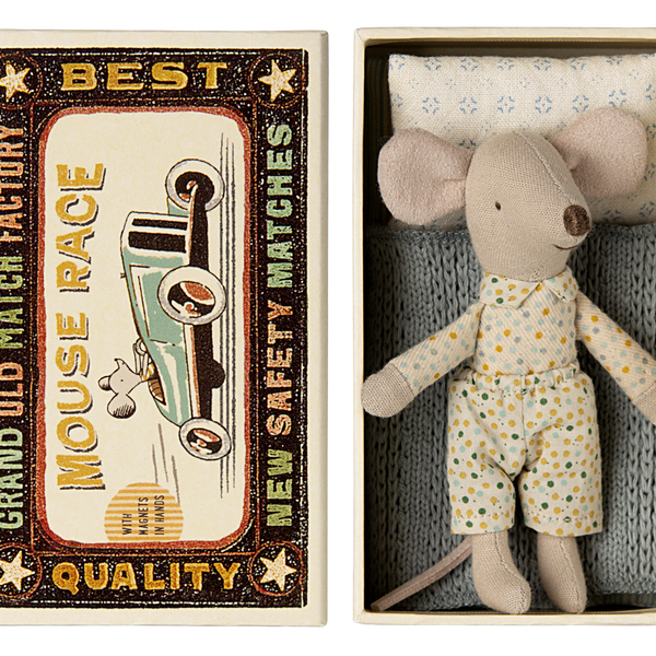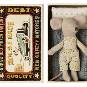 Myszka Maileg młodszy brat z kolekcji ss24. Mieszka w pudełku po zapałkach.