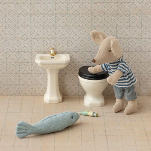 Metalowa umywalka łazienkowa dla myszek Maileg. Pasująca do myszek Little Sister/Brother. Sprawdzi się podczas zabaw z myszkami Maileg oraz jako wyposażenie domu i zamku dla myszek Maileg.Umywalkę zdobi złoty kran.