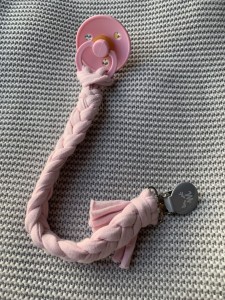 Praktyczna zawieszka do smoczka wykonana z plecionego sznurka dzianinowego.