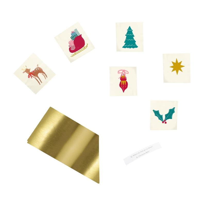 Wyjątkowa choinka bożonarodzeniowa z niespodzianką Meri Meri! Wyobraź sobie wyraz twarzy dziecka, kiedy rozpakowuje tą wspaniałą choinkę pokrytą bibułą, która jest wypełniona prezentami! Zdejmij warstwy, aby odsłonić papierowy kapelusz ze złotej folii, naklejki, tymczasowe tatuaże i ciekawostki. Następnie w strzępach papieru odkryj kopertę zawierającą oszałamiający emaliowany naszyjnik z gwiazdą.