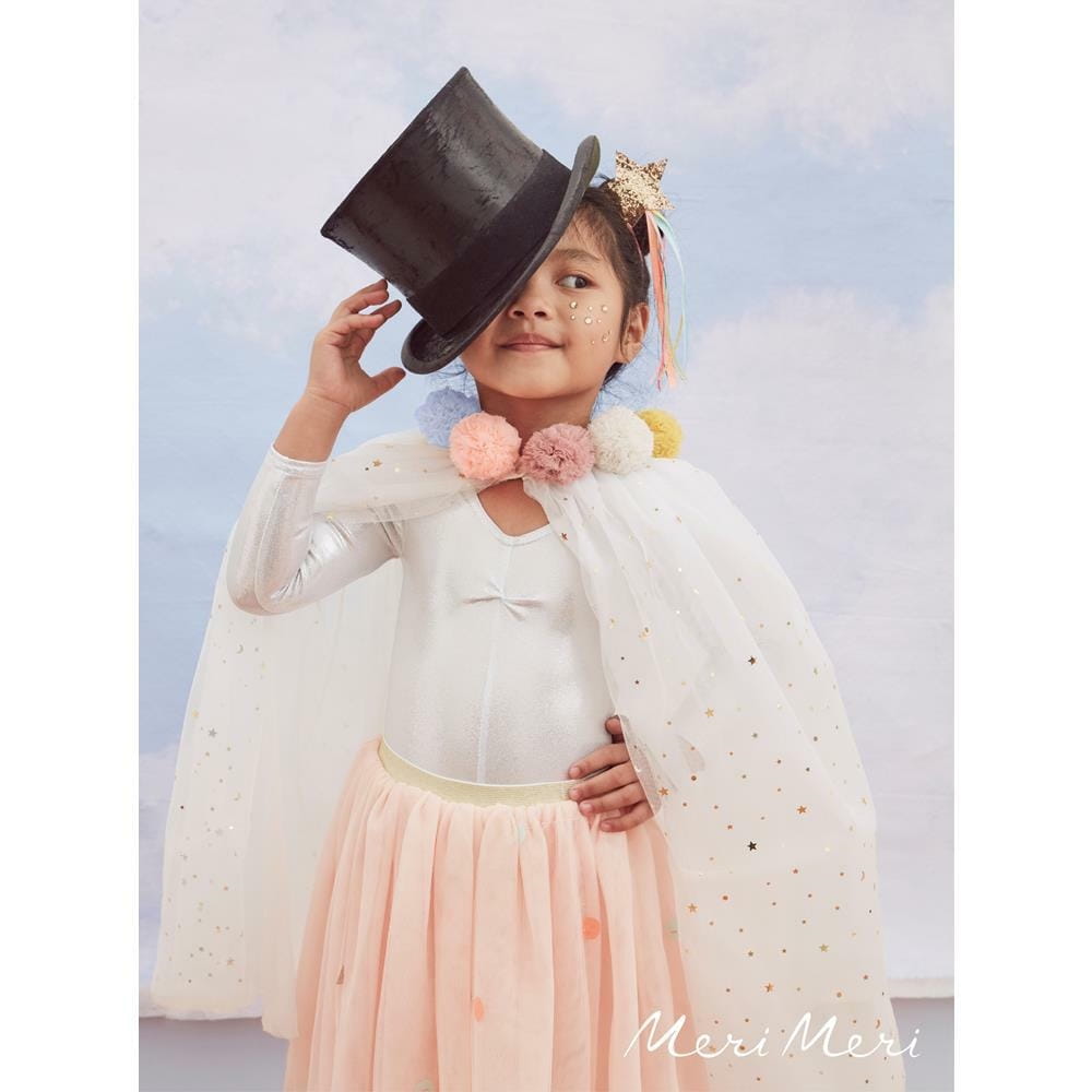 Peleryna dla dzieci w wieku 3-6 lat. Ozdobiona błyszczącymi gwiazdkami i tiulowymi pomponami wokół szyi. Posiada podszewkę. Zapinana na napę. W zestawie brokatowa różdżka z tasiemkami. Obwód wokół szyi: 45,7 cm. Długość: 71,1 cm.