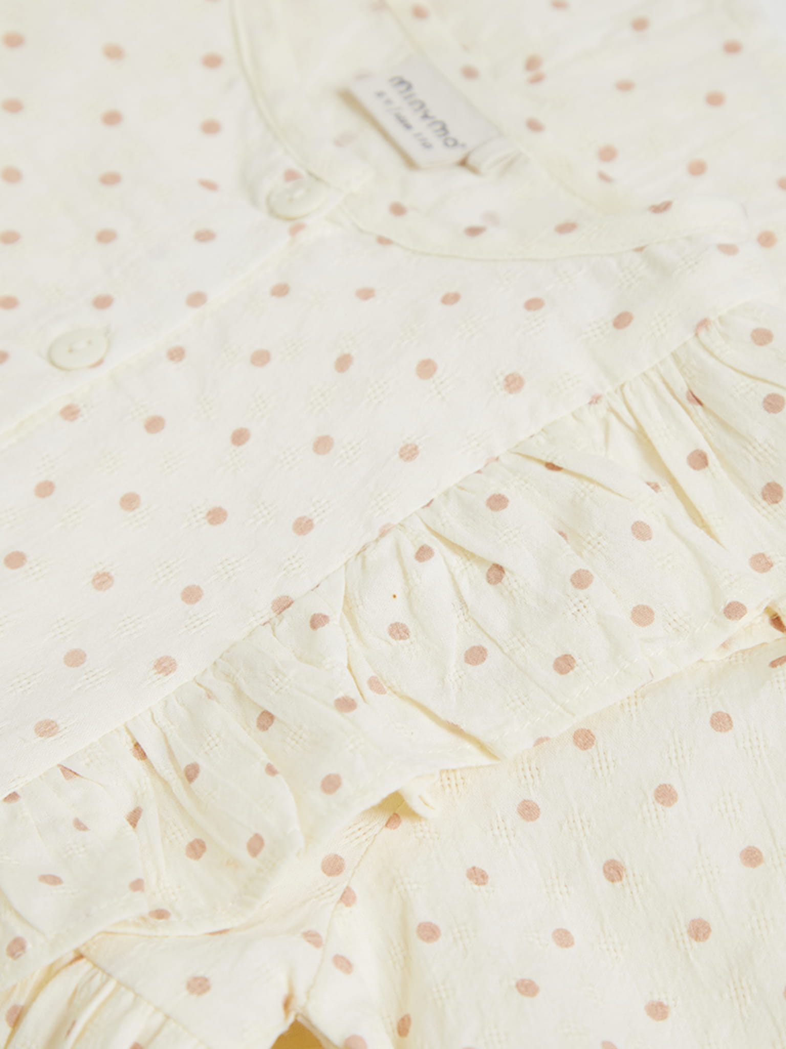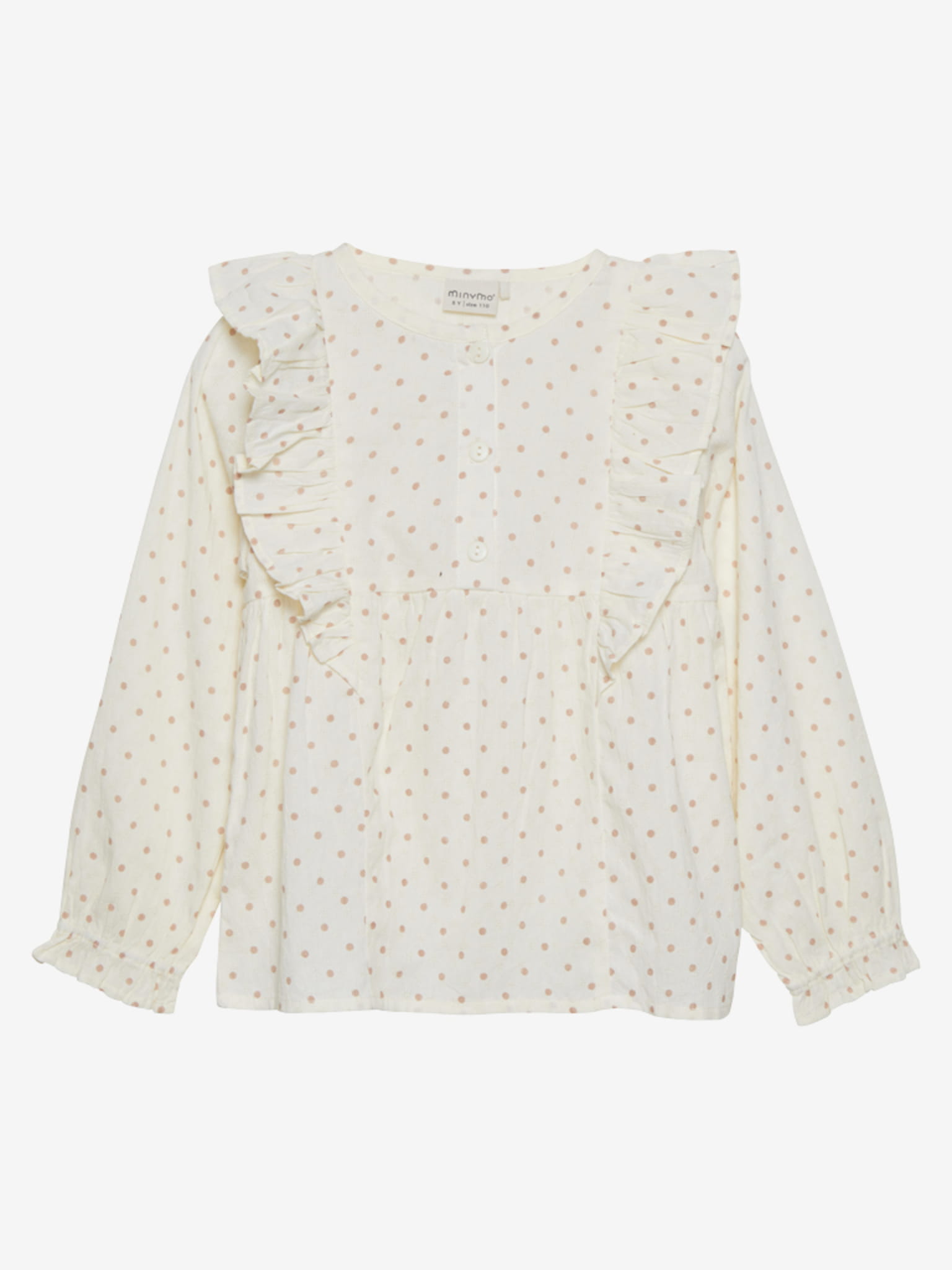 Minymo koszula z nadrukiem w kropki na całej powierzchni. Posiada marszczenia na ramionach i guziki z przodu. Rękawy mają elastyczną krawędź.