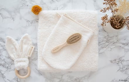 Zestaw kąpielowy to przepięknie zapakowany komplet składający się z ręcznika z kapturkiem, myjki, szczoteczki do główki z naturalnym włosiem. Idealny produkt na wspaniały prezent.
