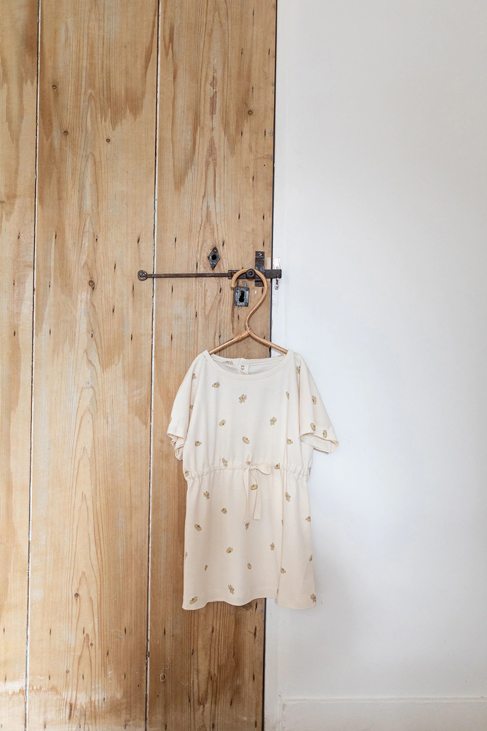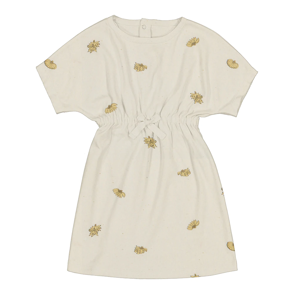 Wygodna sukienka z krótkim rękawem z organicznego dżerseju z bawełny pima. W pasie gumka. Ozdobna kokarda. Zatrzaski z tyłu ułatwiające zakładanie. Tło w kolorze ecru z nadrukiem banana.