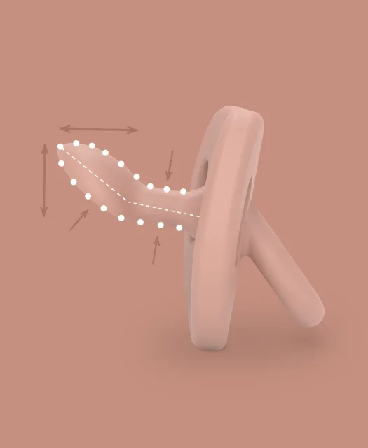 Smoczek z łatwością dopasowuje się do podniebienia, zostawiając językowi wystarczającą ilość miejsca.
